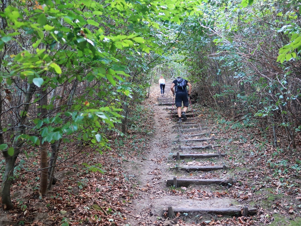 Bár kissé kaptatós, de ezzel a szintkülönbség nagy részét leküzdjük. A lépcső tetején pedig padokon tudunk megpihenni.